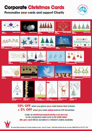 Children’s Safety Australia Inc. (CSA) has embarked on a fundraising campaign in partnership with Charity Greeting Cards. A wide range of beautiful Christmas cards and hampers are available with the ability to personalise your message, including the text, font and colour. Forty cents (40c) per card and 10% of the cost of hampers will be donated to CSA.